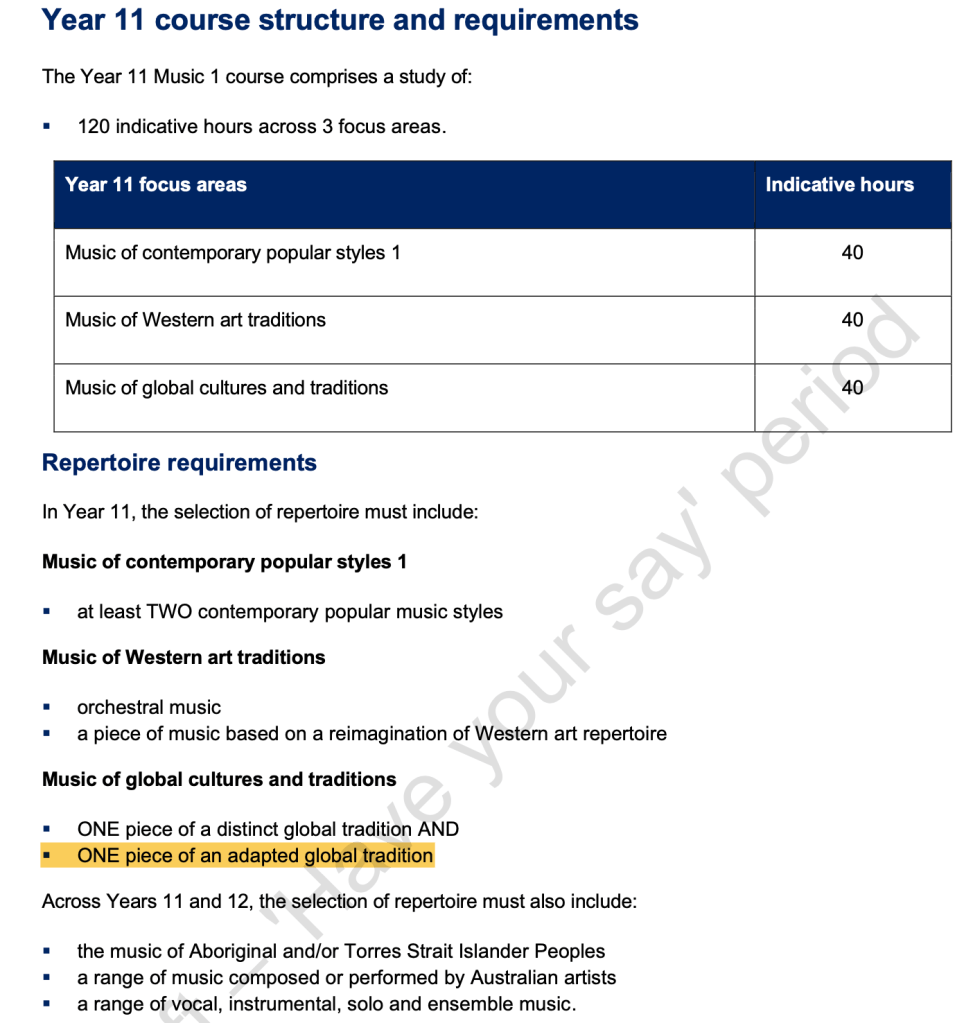 The vast majority of musicians have a specific area they work in which may not include Western Art music… So why are we making our students spend so much time on it? What are we saying to these students about what we value in music in Australia? I have no issue with the inclusion of music from global cultures in the Year 11 syllabus, however there is simply no need for WAM to be mandatory in the senior years. The syllabus would better serve both students and teachers if this focus area was chosen by the teachers based on their classes (with WAM as an option). If a third focus area must be assigned, Australian students would be better served by an in depth study of First Nation’s Music (Then and Now) even if it did mean a considerable amount of new resources being released by NESA.